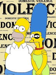 Marge Simpson stands grimly with a black eye next to an almost- grinning, vacant Homer.